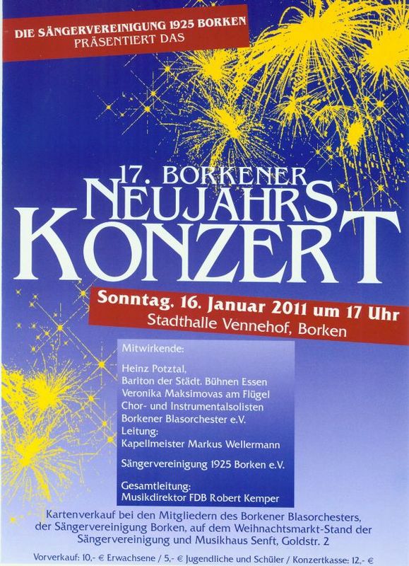 Kartenverkauf bei den Mitgliedern des Borkener Blasorchesters, der Sängervereinigung Borken und im Musikhaus Senft, Goldstr. 2, Borken