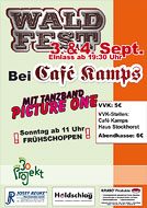 Das Waldfest bei Cafe Kamps beginnt am Samstag, den 03. Sept. 2011 um 19:30 Uhr mit einem Konzert der Tanzband „Picture One“, die ausdrücklich zum Tanzen einlädt. Sie wird zahlreiche bekannte Melodien für alle Altersgruppen zu Gehör bringen. Am Sonntag, den 04. Sept. 2011 folgt ab 11 Uhr ein musikalischer „Frühschoppen“, bei dem auch Blasmusik auf dem Programm steht. Der Eintritt kostet am Samstag an der Abendkasse 6 Euro pro Person, im Vorverkauf 5 Euro. Vorverkaufsstellen sind bei Cafe Kamps sowie in der Gaststätte „Haus Stockhorst“, Vardingholt-Kirche, eingerichtet.