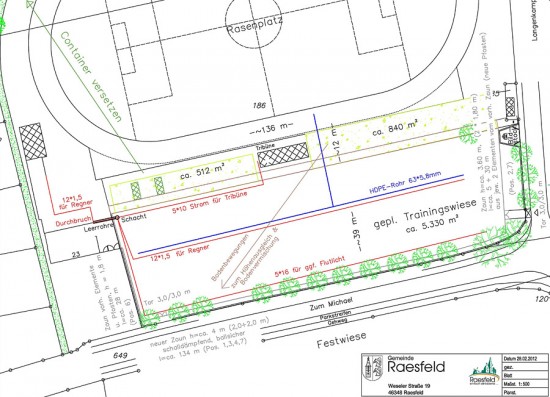 „In diesem Jahr wird die neue Trainingswiese sowohl vom Schützenverein als auch von den Sportlern noch nicht benutzt werden können“, erklärt Andrea Ebbing vom Bauamt der Gemeinde Raesfeld. „Wir planen, im Mai den Rasen zu säen. Bis sich eine Grasnarbe gebildet hat, die der täglichen Belastung durch Sportler und viele Fußballschuhe standhält, wird es bis zum kommenden Frühjahr dauern.“