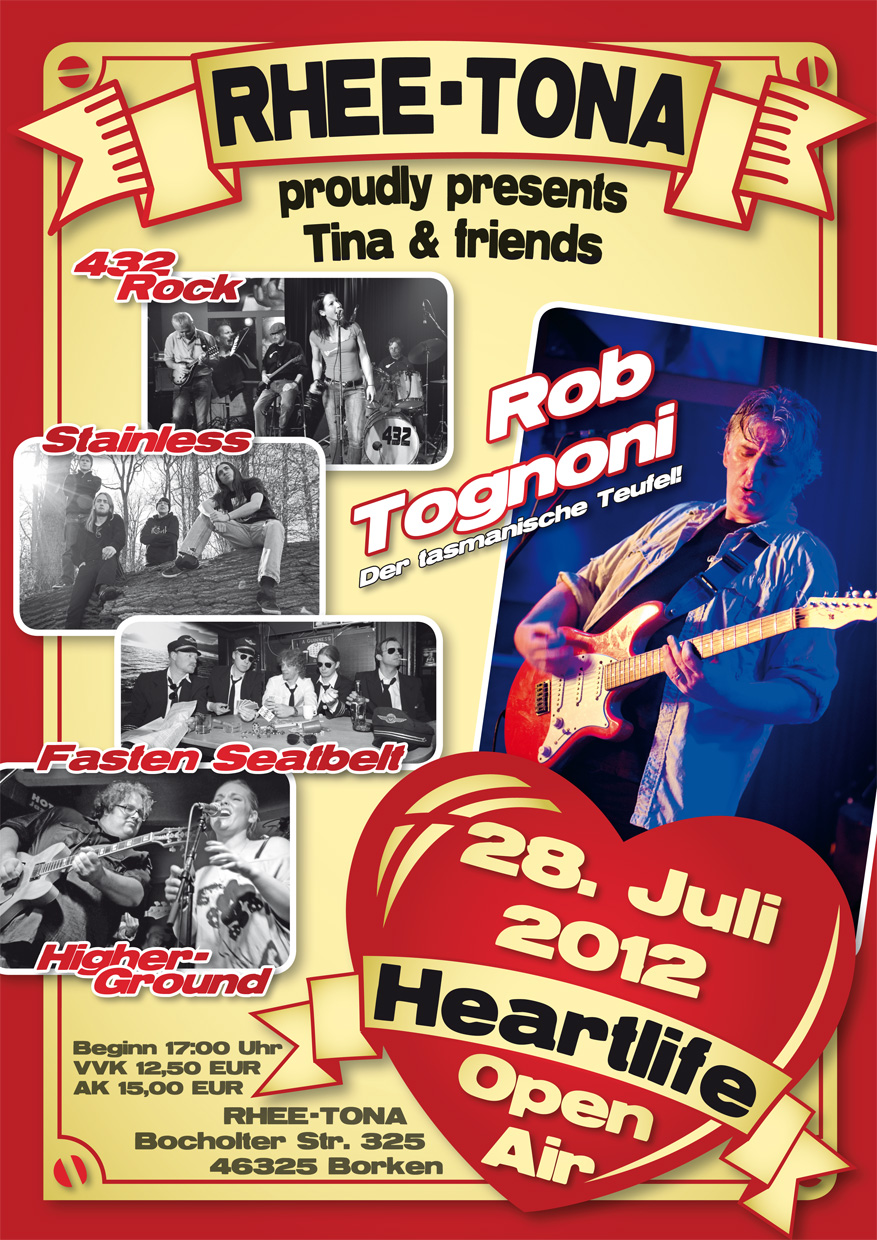 Am 28.07.2012 ab 17:00 Uhr ist es wieder so weit, es startet das alljährliche RHEE-TONA Open Air der etwas anderen Art. Nicht das RHEE-TONA Team hat die Bands ausgewählt, sondern Tina&friends wollen sich einen OpenAir-Traum erfüllen und haben befreundete, hochkarätige Musiker eingeladen. Ein musikalisch vielseitiges Line up soll die Gäste durch den Abend führen.