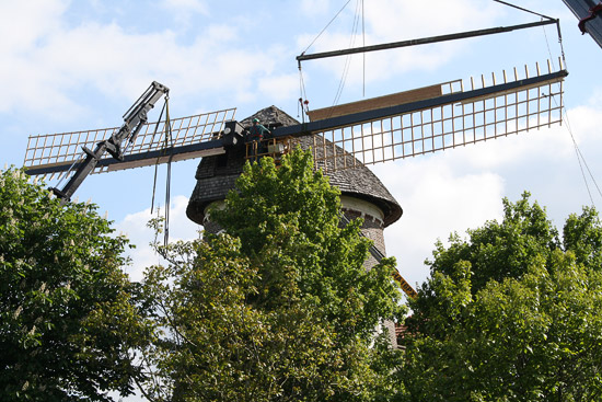 Die neuen Flügel bestehen aus Stahlruten und einem Gatter aus sibirischer Lärche und sind durch die Auswahl der Materialien weniger anfällig als der frühere Mühlenflügel mit Holzruten. Mit einem großen Kranwagen werden die neuen schweren Flügel an die Turmhaube mit dem Wellkopf in rund 12 Metern Höhe gezogen und dann fachmännisch montiert.
