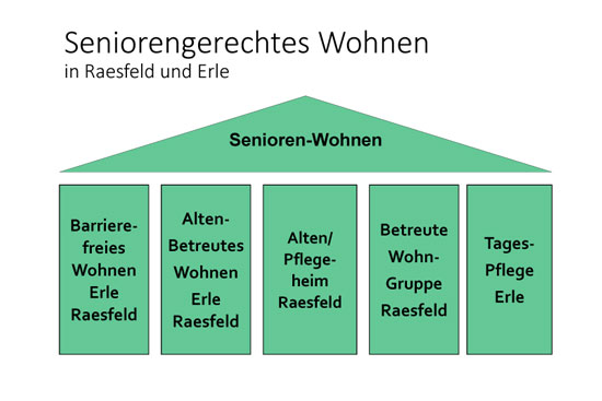 Der Verkauf ist Teil des gemeindeweiten Konzeptes auf dessen Grundlage ein breit gefächertes Angebot für unterschiedliche seniorengerechte Wohnformen vorgehalten werden soll. So ist erst im November das Haus an der Gartenstraße in Raesfeld eröffnet worden. Damit stehen neben einer Vielzahl von barrierefreien Wohnungen, die in den vergangenen Jahren in Raesfeld erbaut wurden, das Seniorenhaus St. Martin, Im Mensing, als stationäre Einrichtung, das Haus an der Gartenstraße mit einer Wohngruppe für Demenzkranke sowie dem betreuten Wohnen und dann die drei Häuser am Erler Kirchring mit einer Tagespflegeeinrichtung sowie dem betreuten Wohnen als seniorengerechte Wohnform zur Verfügung.