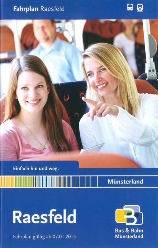 Ab sofort liegt der neue Ortsfahrplan für die Gemeinde Raesfeld kostenlos im Rathaus und in vielen öffentlichen Einrichtungen (Bücherei, Naturparkhaus, Volksbanken und Sparkassen) aus. Darin findet man Informationen über alle Busverbindungen innerhalb des Ortes sowie von und nach Raesfeld. Der neue Fahrplan ist ab dem 07.01.2015 gültig.