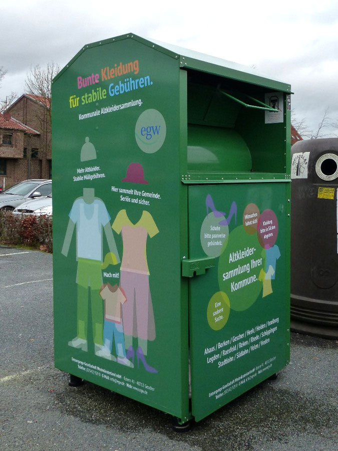 Die Gemeinde Raesfeld hat, wie 13 weitere Gemeinden im Kreis Borken, die EGW mit dem Aufbau und der Durchführung einer kommunalen Altkleidersammlung beauftragt. Ziel ist es, u.a. den Wildwuchs bei den privaten Sammelunternehmen einzuschränken, um die karitativen Sammlungen zu stärken. Die erzielten Erlöse sollen zudem dazu beitragen, die Abfallgebühren in der Schlossgemeinde stabil zu halten.