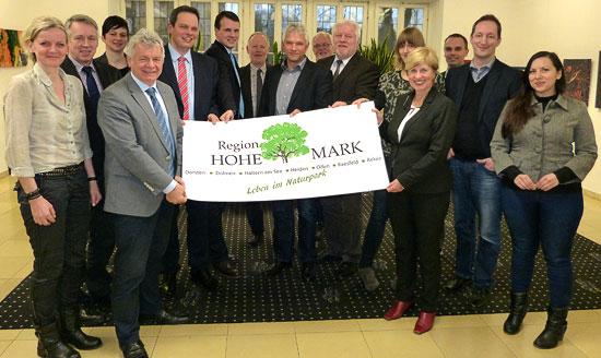 Noch bis zum 16. Februar können sich Städte und Gemeinden für das EU-Förderprogramm LEADER bewerben. Die Kommunen Dorsten mit den Ortsteilen Deuten, Lembeck und Rhade, Dülmen, Haltern am See, Heiden, Olfen, Raesfeld und Reken arbeiten daher derzeit gemeinsam mit dem Büro planinvent aus Münster unter Hochdruck an ihrem Wettbewerbsbeitrag als Region „Hohe Mark“. Die Bürgermeister der Gemeinden und Städte sowie Vertreter aus den Verwaltungen stellten am Mittwoch, 28. Januar in Dülmen ihr Lokales Entwicklungskonzept vor. Viele verschiedene Projektideen zu den Handlungsfeldern „Gesundheit vor Ort“, „Versorgung vor Ort“, „Für alle Generationen“ sowie „Region Hohe Mark erleben“, die über die kommunalen Grenzen hinaus wirken sollen, wurden in den vergangenen Wochen zusammengeführt und konkretisiert. Diese fließen in die Bewerbung mit ein. Ob die Region „Hohe Mark“ im Wettbewerb Erfolg haben wird, entscheidet sich voraussichtlich im Juni 2015. Von insgesamt 3,1 Millionen Euro Fördergeldern würde die Region dann profitieren.