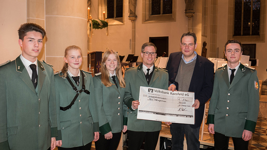 Insgesamt kamen so 1700 Euro zusammen. Beim Weihnachtskonzert der Burgmusikanten am dritten Advent in der Pfarrkirche St. Martin wurde der Scheck für die „Aktion Hoffnungsschimmer – Hilfe für Flüchtlinge in Not“ vom 1. Vorsitzenden der Burgmusikanten, Matthias Sümpelmann, an Bürgermeister Andreas Grotendorst symbolisch übergeben. Dieser wird den Scheck an den 1. Vorsitzenden der Aktion Hoffnungsschimmer übergeben. Alfred Holz zeigte sich positiv überrascht von der Aktion in Raesfeld und bedankt sich bei allen Spendern. Da es darüber hinaus aus Raesfeld weitere Geldspenden auf das Konto der Aktion Hoffnungsschimmer gegeben hat, wird er voraussichtlich Anfang nächsten Jahres noch einmal ausführlich über die Arbeit des Vereins vor Ort in Raesfeld berichten.